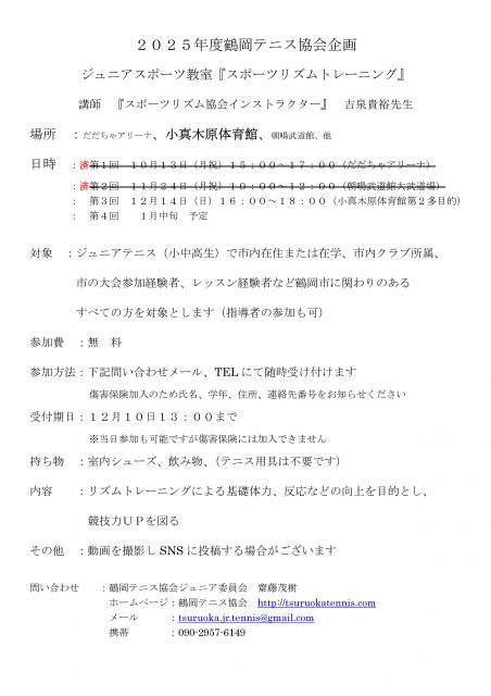ジュニアスポーツ教室 第3回スポーツリズムトレーニング開講のお知らせ 投稿日:2025年12月1日 お問い合わせは下記メールアドレス又は電話番号へお願い致します。 メール:tsuruoka.jr.tennis@gmail.com 携帯 :090-2957-6149